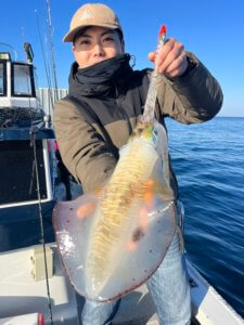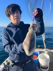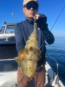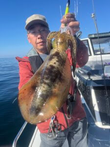 ベタ凪、無風、0ノット…。エギングに近い釣り方で厳しい状況でしたが、1.3kgを頭に、コウイカもキロ超え。