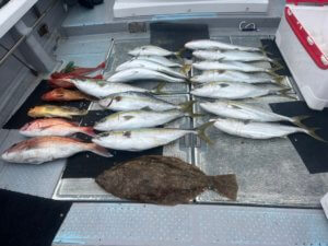 ヒラゴ、ヤズ、ヒラメ、真鯛、ホーボー、アコウ、アオナ