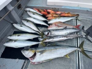 ヒラマサ、サワラ、ヤズ、真鯛、アコウ、ウッカリカサゴ、カサゴ、アヤメカサゴ