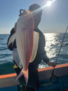 波が落ち着いてきたタイミングで沖合ポイントへ移動。良型も数本混じりましたが、その後は潮が止まり、全体的に渋い展開となりました💦
