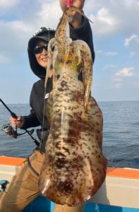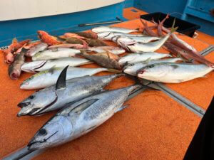 コシナガマグロ、ヤズ、真鯛、イトヨリ、アコウ、オオモンハタ、アヤメカサゴ、アオリイカ、ヤガラ ほか