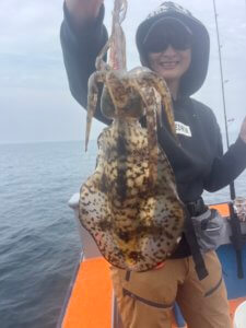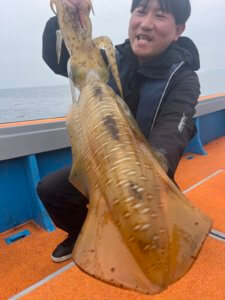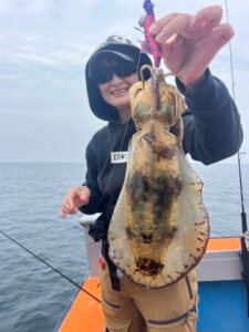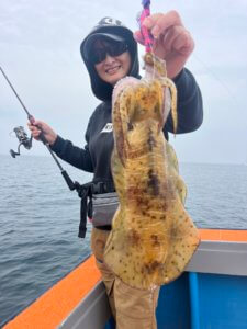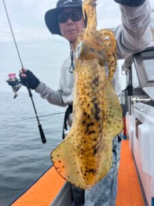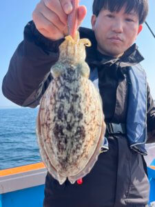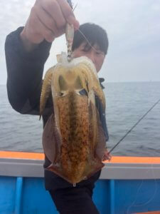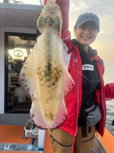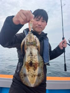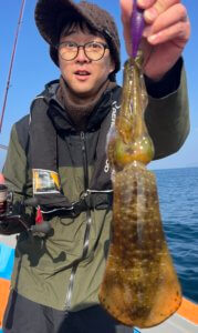 まずはティップランからスタート。久しぶりの出港となりましたが、なんと3.3kgのレッドモンスター級アオリイカが登場!玄界灘のポテンシャルを感じる一杯でした。